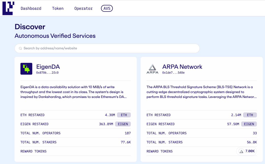 The AVS Dashboard (also known as AVS Marketplace) lists registered AVSs.